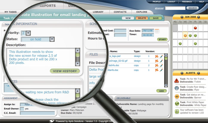 The marketing department as a whole can work more productively without worrying about keeping a myriad of spreadsheets up to date and focus on their work. Aprix Marketing Manager simplifies the management tasks associated with marketing resources so the whole team can maximize the time they spend on doing what they do best: Marketing!